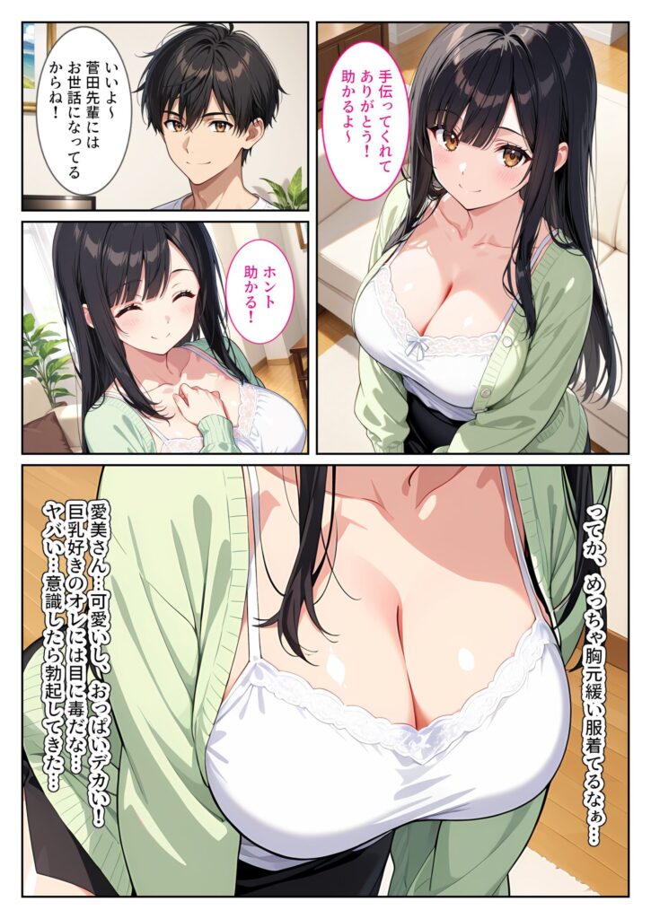 旦那不在の家に掃除の手伝いに呼ばれた一也は、愛美の軽い部屋着からこぼれ落ちそうな巨大なおっぱいに思わず勃起してしまう。